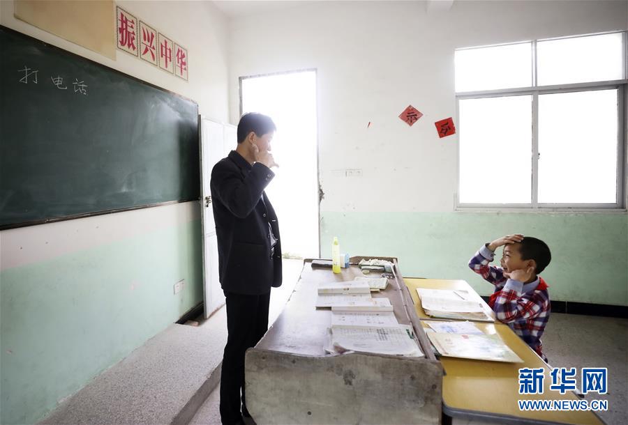 5月8日,王北海(左)在教室內(nèi)為陳威宇講解“打電話”的流程。江西省瑞金市大柏地鄉(xiāng)三河小學(xué)坐落于大山深處。陳威宇是學(xué)校里唯一的學(xué)生。陳威宇今年9歲,家庭貧困,上學(xué)不便。為解決這一難題,當(dāng)?shù)卣疀Q定恢復(fù)陳威宇家附近三河小學(xué)的辦學(xué)工作,今年46歲的王北海被安排為專職教師,從周一至周五,王北海幾乎每天24小時(shí)陪伴在陳威宇身旁,既當(dāng)老師也當(dāng)“家長(zhǎng)”,照料他的學(xué)習(xí)和生活。新華社記者蘭紅光攝