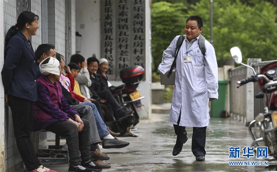 5月28日,何永清(右)一大早出門“送醫(yī)上門”后回到村衛(wèi)生室時,門口排滿了等待就診的村民。何永清是陜西省略陽縣樂素河鎮(zhèn)瓦房村衛(wèi)生室的一名村醫(yī),幼年時因車禍失去右臂。2006年7月從漢中市衛(wèi)校畢業(yè)后,他選擇回到山大溝深的秦嶺腹地故鄉(xiāng)工作。十多年來,何永清堅守在基層衛(wèi)生第一線,鄉(xiāng)親們親切地稱他為“我們的獨臂村醫(yī)”。新華社記者陶明攝