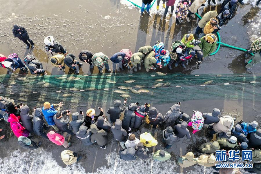 12月18日,人們?cè)谥Z干湖觀看冬捕活動(dòng)(無(wú)人機(jī)拍攝)。新華社記者劉磊攝