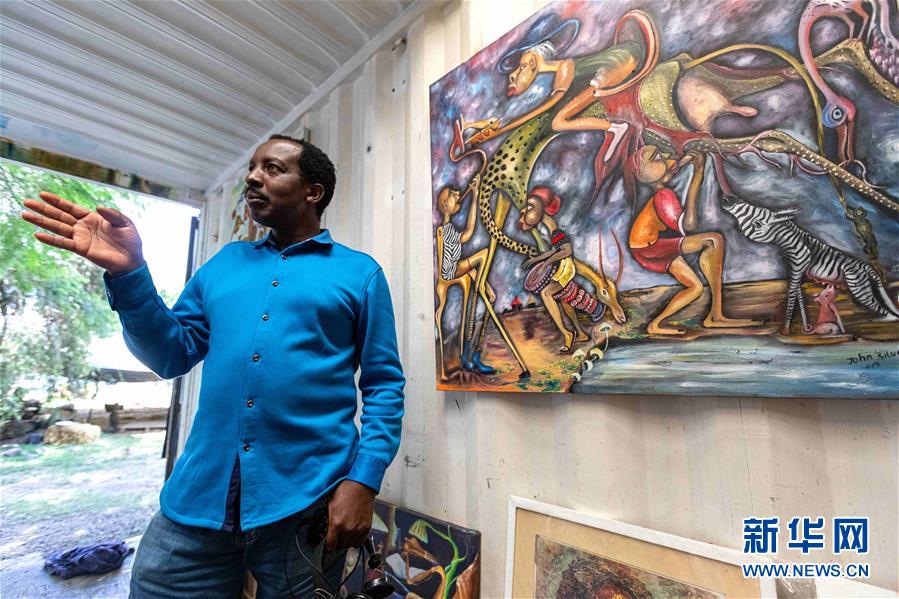 12月20日,在肯尼亞內(nèi)羅畢庫奧納藝術(shù)中心,一名畫家介紹自己的作品。 新華社記者 王騰 攝