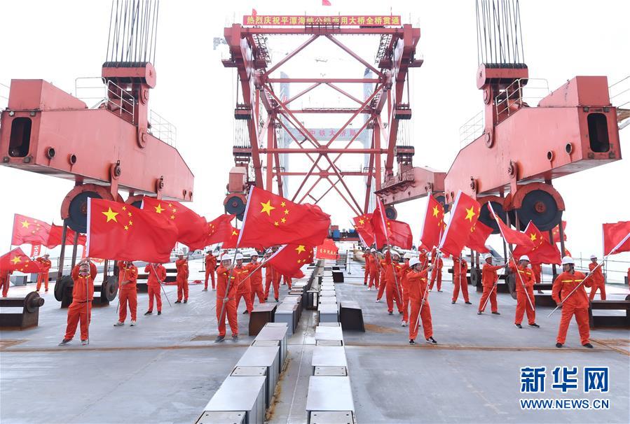 6月5日,福平鐵路平潭海峽公鐵兩用大橋的工作人員慶祝元洪航道橋主橋成功合龍。新華社記者林善傳攝