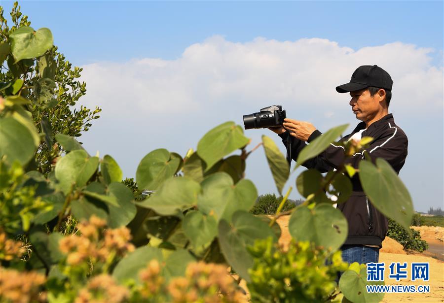 海南新盈紅樹林國家濕地公園巡護(hù)員兼監(jiān)測員羅理想在濕地公園內(nèi)拍攝紅樹林(12月11日攝)。 羅理想2006年起開始參與紅樹林濕地的保護(hù)工作,近年來他參加了很多關(guān)于濕地的培訓(xùn)。2016年,羅理想在工作中監(jiān)測到極危鳥種勺嘴鷸,當(dāng)時有許多媒體做了報道,后來他又配合專家在濕地公園里發(fā)現(xiàn)了拉氏紅樹,“那個時候感覺自己的工作很有價值”,羅理想說。新華社記者楊冠宇攝