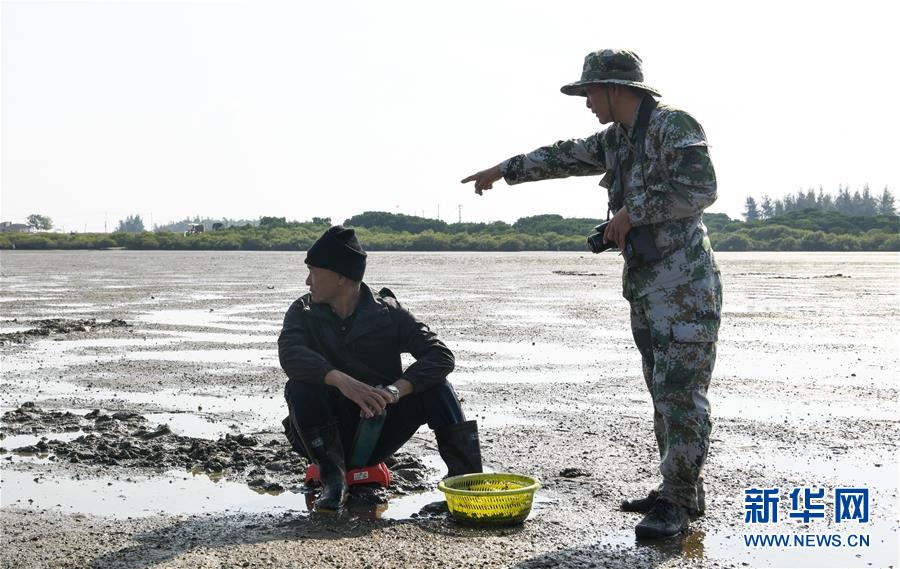 海南儋州新英灣紅樹林市級自然保護區(qū)護林員陳正平(右)在保護區(qū)內的灘涂上向村民普及紅樹林濕地相關知識(12月10日攝)。陳正平2010年開始在保護區(qū)工作,他將工作發(fā)展成愛好,廣泛參加各種培訓和業(yè)內交流。他在工作中拍到瀕危鳥類白肩雕出現在海南的照片,這刷新了海南省的鳥種記錄。新華社記者楊冠宇攝
