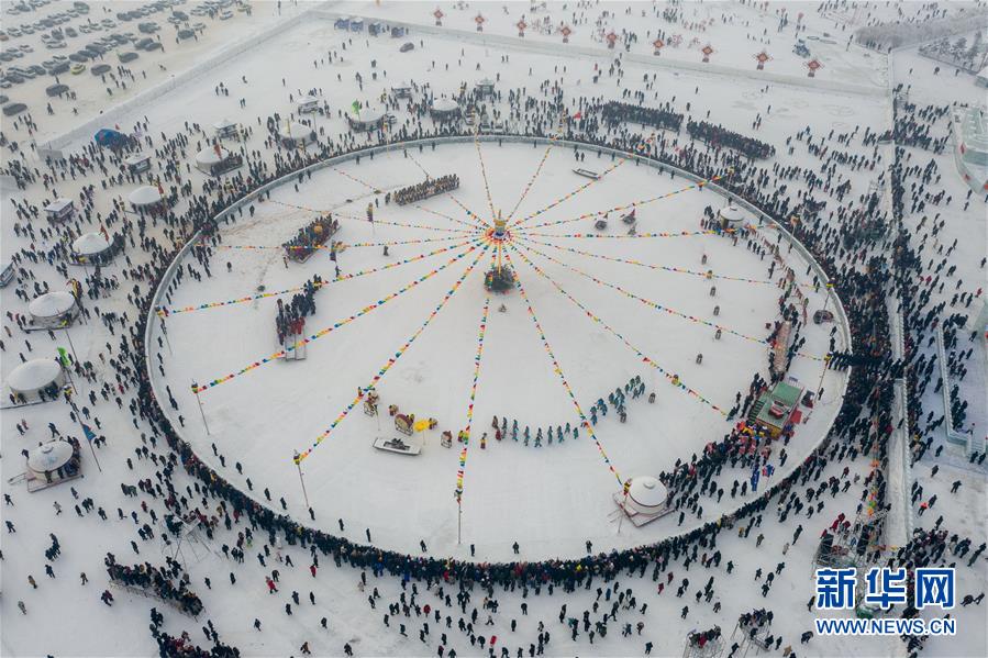 12月28日無人機拍攝的查干湖第十八屆冰雪漁獵文化旅游節(jié)開幕式現(xiàn)場。