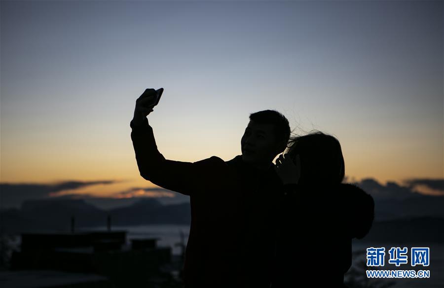 12月28日,在峨眉山金頂,一對情侶在落日余暉中拍照。時值冬日,峨眉山銀裝素裹、宛如仙境。新華社記者李夢馨攝