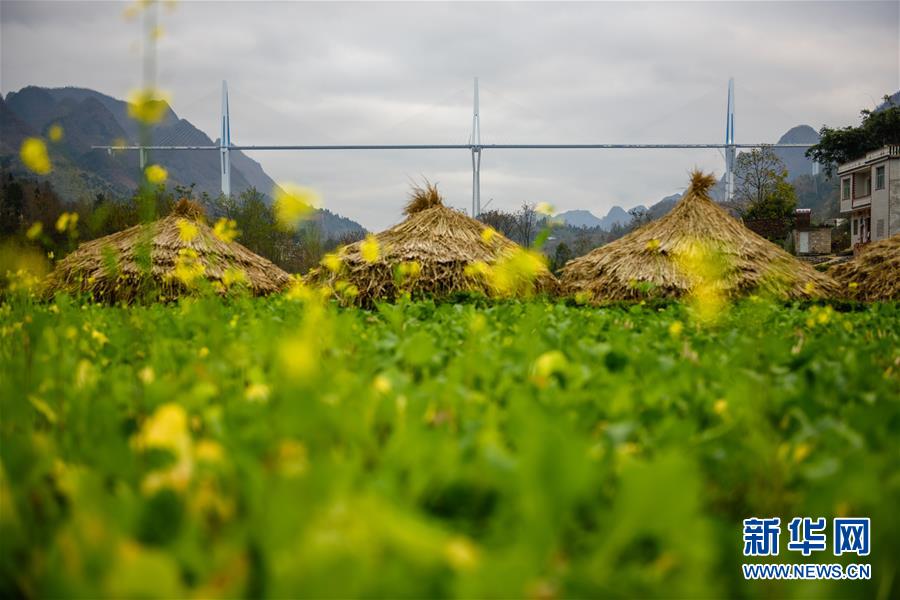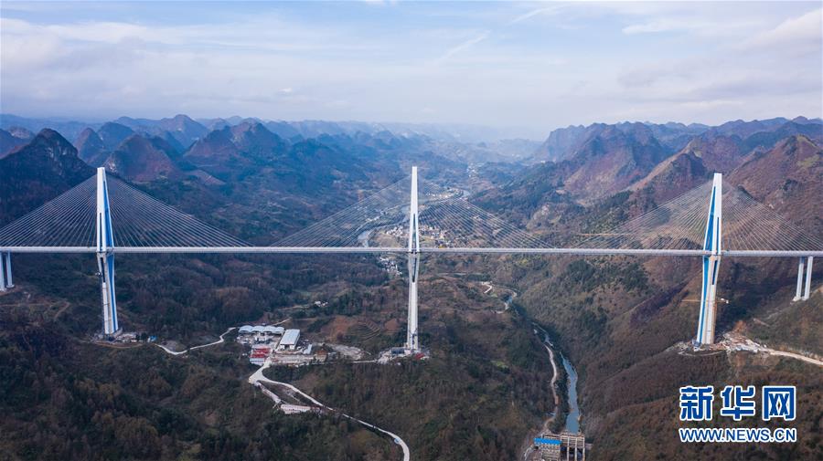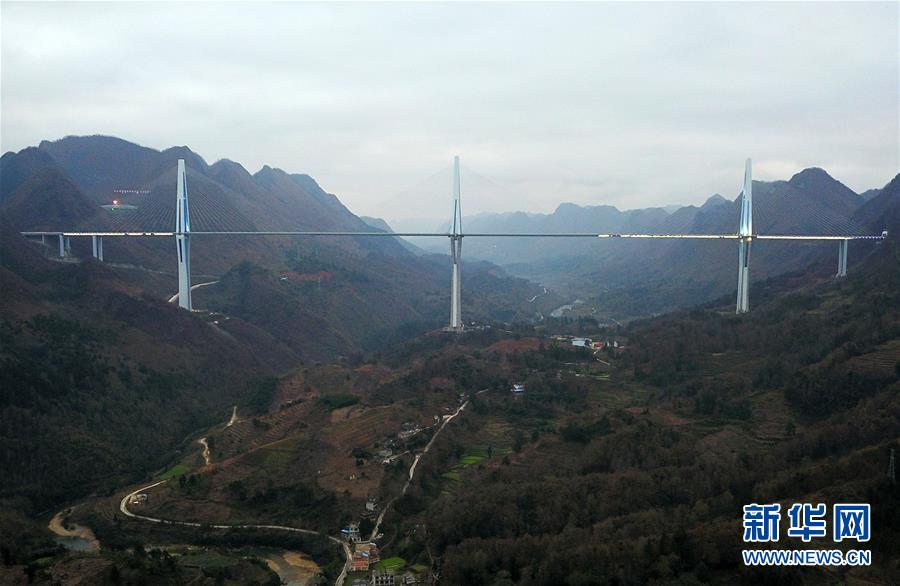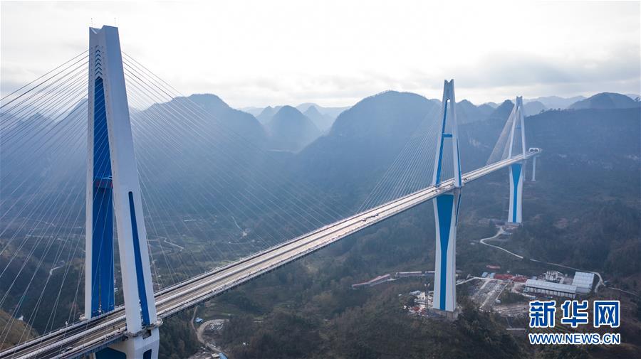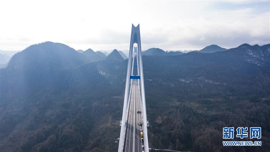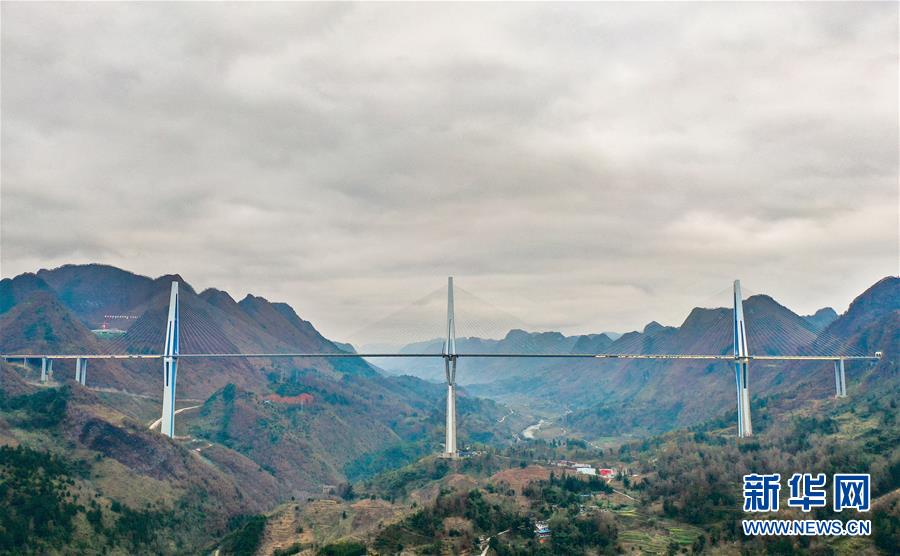 2019年1月7日無(wú)人機(jī)航拍的平塘特大橋橋塔全景,中為高332米的世界第一高混凝土橋塔。新華社記者歐東衢攝