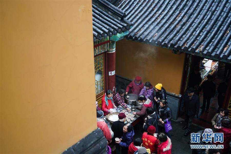1月2日,在南京玄奘寺,工作人員在給市民贈(zèng)粥。 當(dāng)日是農(nóng)歷臘月初八,中國傳統(tǒng)臘八節(jié)。 新華社記者 季春鵬 攝