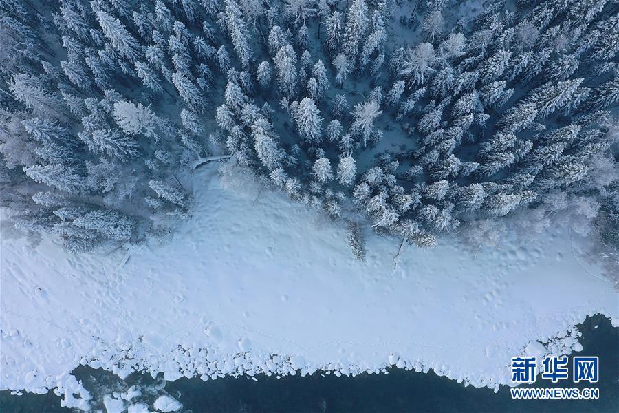 這是1月3日拍攝的喀納斯河畔的霧凇景觀(無人機照片)。新華社記者宋彥樺攝