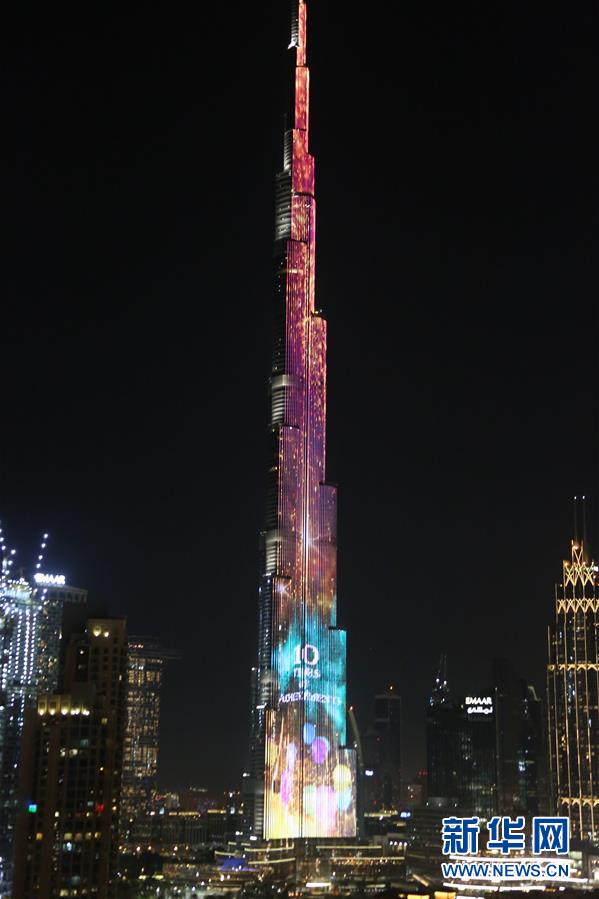 這是1月4日在阿聯(lián)酋迪拜拍攝的世界第一高樓哈利法塔慶祝開放10周年燈光秀。新華社記者蘇小坡攝