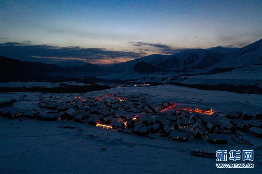 這是2019年12月31日拍攝的傍晚的禾木村(無人機(jī)照片)。 在新疆阿勒泰地區(qū)布爾津縣禾木村,不少游客選擇以觀光旅游的方式“別樣跨年”。游客們觀賞雪鄉(xiāng)風(fēng)景,體驗(yàn)馬拉爬犁、騎馬等冬游項(xiàng)目,參加篝火狂歡、潑雪迎新年等慶?;顒?dòng),冰天雪地?zé)崆椴粶p,別有一番風(fēng)情。 新華社記者 宋彥樺 攝