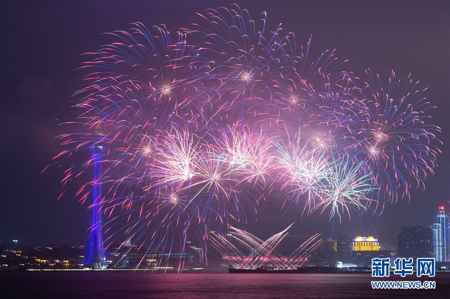 2019年12月31日,澳門特區(qū)在旅游塔對(duì)開海面綻放煙花,迎接新一年。 新華社記者 張金加 攝