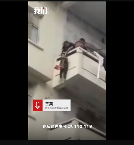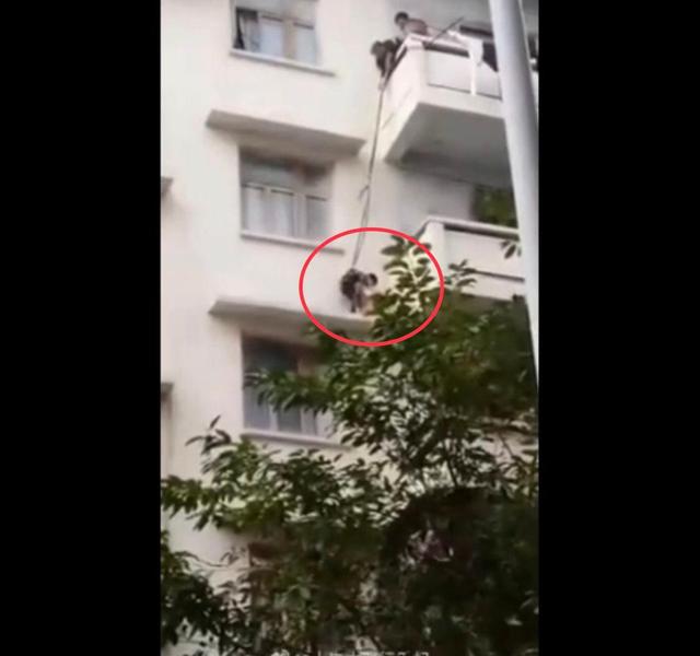 小男孩被大人們用繩子系著腰,晃晃悠悠地吊下三樓遮雨平臺后,勇敢地走向貓,將其抱起,接著又被5樓的奶奶等人晃晃悠悠地吊起往上拉,小男孩全程表情木然,絲毫未見緊張害怕。萬幸的是,最終男孩平安并順利完成任務。