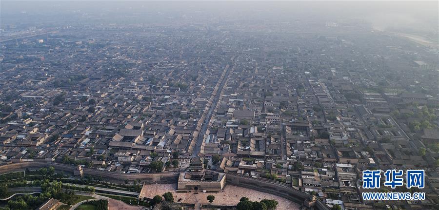 這是7月20日無人機(jī)從南門拍攝的平遙古城全景。鳥瞰平遙古城,形同一只欲行未動(dòng)的烏龜,“龜”頭南尾北,上下東西四門比擬為龜之四足,故有“龜城”之說。