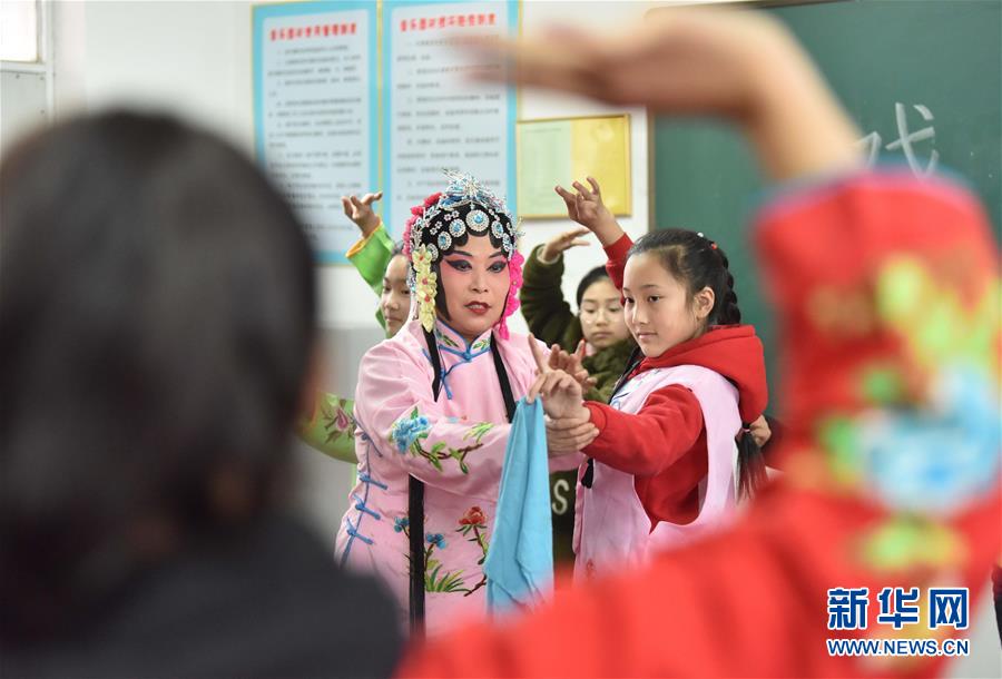 1月7日,定州市興定秧歌劇團演員在明月店鎮(zhèn)吳咬村小學(xué)指導(dǎo)學(xué)生學(xué)習(xí)戲曲表演技藝。