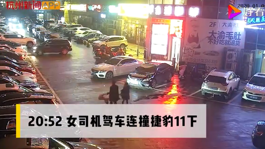 通過(guò)監(jiān)控發(fā)現(xiàn),捷豹車(chē)當(dāng)時(shí)并沒(méi)有停在停車(chē)位上,而是橫著停在停車(chē)位前的通道上,正好擋住了停在停車(chē)位里面的車(chē)輛。晚上8點(diǎn)40左右,一輛白色豐田普拉多越野車(chē)被捷豹擋住無(wú)法出去,10多分鐘后,司機(jī)通過(guò)倒車(chē)再加速十幾次撞擊捷豹,最終把車(chē)輛撞開(kāi)后駛離現(xiàn)場(chǎng)。