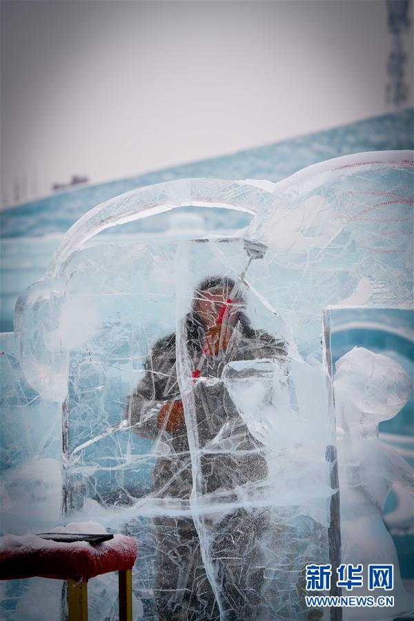 1月7日,參賽者在進(jìn)行冰雕創(chuàng)作。新華社記者王松攝