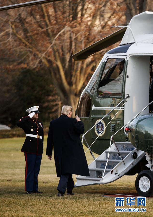 1月9日,在美國(guó)華盛頓的白宮南草坪,美國(guó)總統(tǒng)特朗普(右)準(zhǔn)備登上直升機(jī),前往俄亥俄州參加競(jìng)選集會(huì)。