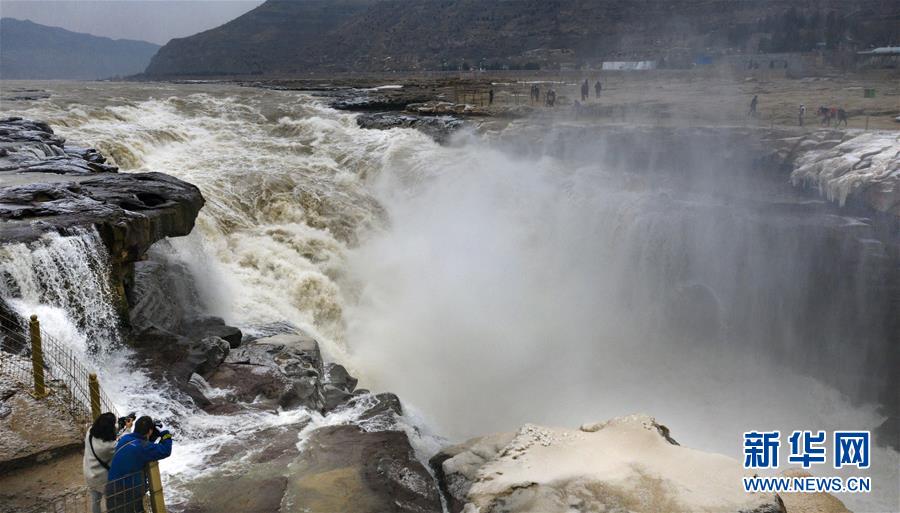 12月14日,游人在壺口瀑布景區(qū)拍照(無人機(jī)拍攝)。新華社記者陶明攝