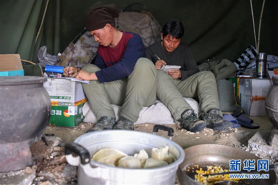 1月14日,查線工在吃飯間隙收聽電臺里報出的不正常道樁號,并記錄在本子上。地球物理勘探是油氣開發(fā)的第一步,相當于給地球做CT。物探工人按照嚴格的測線部署,在相應(yīng)位置鉆井,然后實施地震,采集地震波數(shù)據(jù)。科研人員通過數(shù)據(jù)組成的“CT片”,就能夠清晰地“看”到地下的地質(zhì)結(jié)構(gòu),判斷哪里埋藏有石油或者天然氣。2019年10月,東方地球物理勘探有限責任公司塔里木物探處2113隊進入新疆塔克拉瑪干沙漠腹地,開始中古14-21、塔中2兩個區(qū)塊的三維地震勘探。近2000名物探工人將在1000平方公里的范圍內(nèi)一直工作到2020年4月,這也意味著他們將在塔克拉瑪干沙漠腹地連續(xù)度過第14個除夕夜。蘊藏著豐富石油天然氣資源的新疆塔克拉瑪干沙漠有“死亡之?!敝Q,氣候干燥,年降水量在50毫米以下,冬季地表最低溫度超過零下30攝氏度,是世界油氣勘探難度最大的地區(qū)之一。為避開風季,物探工人每年9、10月份進入沙漠,一直工作到來年4月,夜以繼日與黃沙、嚴寒為伴,用辛勤的汗水,為祖國找油找氣。新華社記者丁磊攝