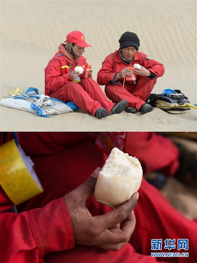 這是一張拼版圖片:上圖為測量工周國燕(左)和丈夫杞朝金在沙漠中解決午餐(1月13日攝);下圖為測量工周國燕在吃冰涼的饅頭(1月13日攝)。地球物理勘探是油氣開發(fā)的第一步,相當于給地球做CT。物探工人按照嚴格的測線部署,在相應(yīng)位置鉆井,然后實施地震,采集地震波數(shù)據(jù)??蒲腥藛T通過數(shù)據(jù)組成的“CT片”,就能夠清晰地“看”到地下的地質(zhì)結(jié)構(gòu),判斷哪里埋藏有石油或者天然氣。2019年10月,東方地球物理勘探有限責任公司塔里木物探處2113隊進入新疆塔克拉瑪干沙漠腹地,開始中古14-21、塔中2兩個區(qū)塊的三維地震勘探。近2000名物探工人將在1000平方公里的范圍內(nèi)一直工作到2020年4月,這也意味著他們將在塔克拉瑪干沙漠腹地連續(xù)度過第14個除夕夜。蘊藏著豐富石油天然氣資源的新疆塔克拉瑪干沙漠有“死亡之海”之稱,氣候干燥,年降水量在50毫米以下,冬季地表最低溫度超過零下30攝氏度,是世界油氣勘探難度最大的地區(qū)之一。為避開風季,物探工人每年9、10月份進入沙漠,一直工作到來年4月,夜以繼日與黃沙、嚴寒為伴,用辛勤的汗水,為祖國找油找氣。新華社記者丁磊攝