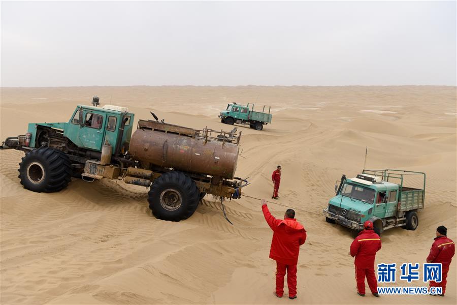 一輛測量作業(yè)車陷在沙坑中,水罐車進行營救(1月13日攝)。地球物理勘探是油氣開發(fā)的第一步,相當(dāng)于給地球做CT。物探工人按照嚴(yán)格的測線部署,在相應(yīng)位置鉆井,然后實施地震,采集地震波數(shù)據(jù)。科研人員通過數(shù)據(jù)組成的“CT片”,就能夠清晰地“看”到地下的地質(zhì)結(jié)構(gòu),判斷哪里埋藏有石油或者天然氣。2019年10月,東方地球物理勘探有限責(zé)任公司塔里木物探處2113隊進入新疆塔克拉瑪干沙漠腹地,開始中古14-21、塔中2兩個區(qū)塊的三維地震勘探。近2000名物探工人將在1000平方公里的范圍內(nèi)一直工作到2020年4月,這也意味著他們將在塔克拉瑪干沙漠腹地連續(xù)度過第14個除夕夜。蘊藏著豐富石油天然氣資源的新疆塔克拉瑪干沙漠有“死亡之海”之稱,氣候干燥,年降水量在50毫米以下,冬季地表最低溫度超過零下30攝氏度,是世界油氣勘探難度最大的地區(qū)之一。為避開風(fēng)季,物探工人每年9、10月份進入沙漠,一直工作到來年4月,夜以繼日與黃沙、嚴(yán)寒為伴,用辛勤的汗水,為祖國找油找氣。新華社記者丁磊攝