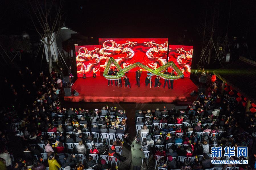 1月14日,杭州市余杭區(qū)中泰街道中橋村的文化公園內在進行“我們的村晚”舞龍表演,吸引了大批當地百姓觀看(無人機照片)。臨近春節(jié),浙江省杭州市余杭區(qū)中泰街道各村社的文化禮堂紛紛上演“我們的村晚”。老百姓自編、自導、自演為主的“土味”聯(lián)歡會因接地氣、親情濃而深受當地百姓的喜愛,成為當地鄉(xiāng)村百姓的新年迎春“文化大餐”。近年來,中泰街道以文化振興助推鄉(xiāng)村振興。目前,中泰街道下屬各村陸續(xù)建成文化禮堂7個、社區(qū)文化家園2個,努力培育和挖掘出一批鄉(xiāng)土文化人才及原創(chuàng)作品,2019年全年開展各類鄉(xiāng)村社區(qū)惠民文體活動累計180余場次。新華社記者徐昱攝