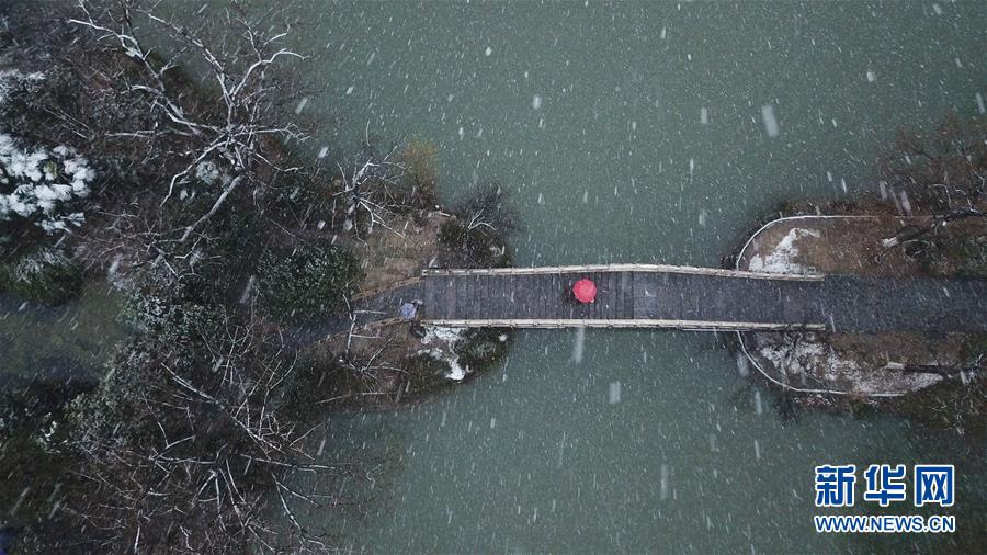1月15日,幾名游客在雪中的合肥市包公園參觀(無(wú)人機(jī)照片)。 當(dāng)日,安徽省合肥市迎來(lái)降雪天氣。雪中的合肥市包公園景色別致。 新華社記者 張端 攝