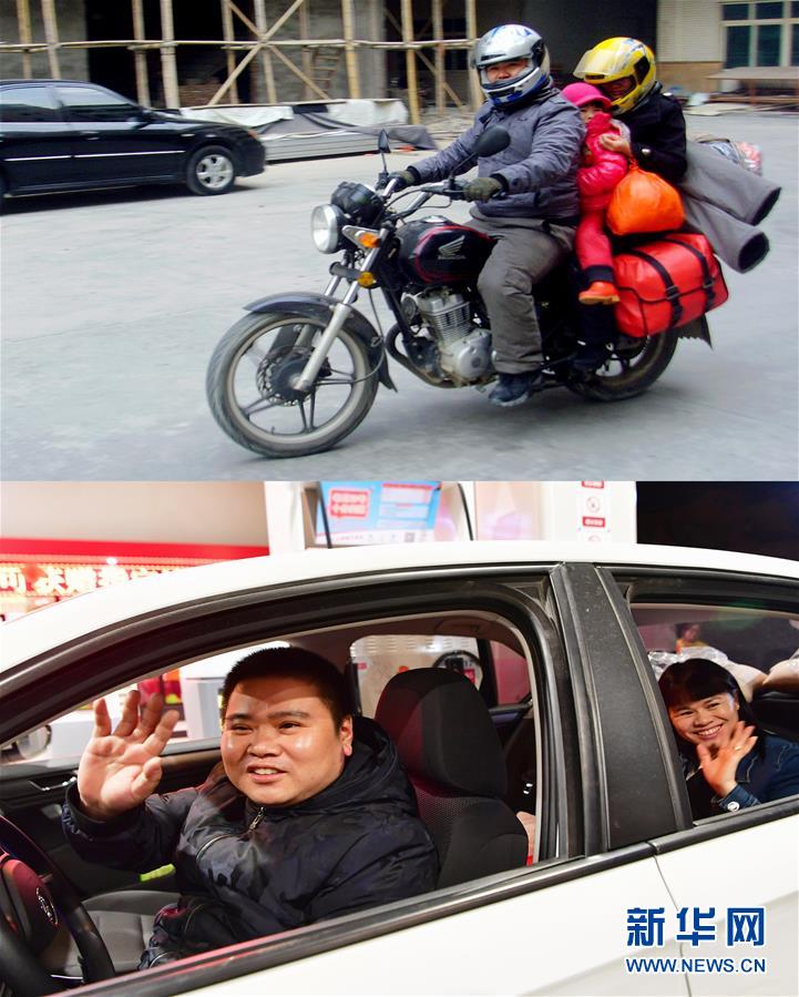 拼版照片:上圖是董日旭帶著家人騎摩托車返鄉(xiāng)過年(資料照片,2013年2月2日攝),下圖是董日旭開著他新買的汽車,帶家人來(lái)到中國(guó)石油泉州博覽大道加油站領(lǐng)加油卡(1月15日新華社記者魏培全攝)。