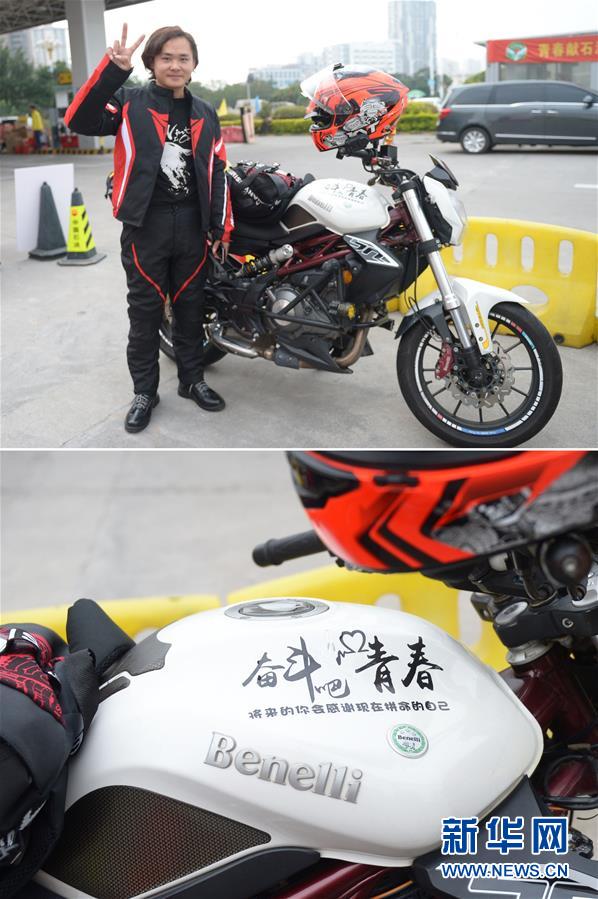 拼版照片:上圖是冉曉紅在中國(guó)石油漳州龍江路站留影,下圖是冉曉紅摩托車(chē)上的標(biāo)語(yǔ)(1月15日攝)。20歲的冉曉紅是重慶人,在福建廈門(mén)從事餐飲業(yè),2019年買(mǎi)了一輛高檔摩托車(chē),2020年與朋友結(jié)伴騎摩托車(chē)返鄉(xiāng),路上預(yù)計(jì)需要五天時(shí)間。 新華社記者 賀燦鈴 攝