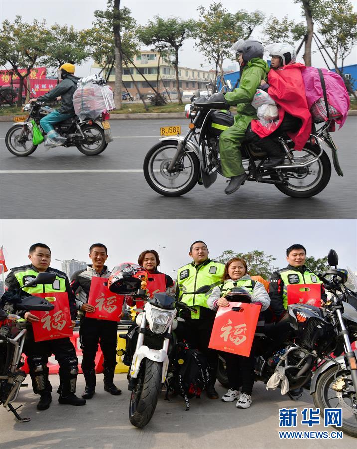 拼版照片:上圖是江西、安徽和湖北籍農(nóng)民工組成的返鄉(xiāng)“鐵騎大軍”騎行在返鄉(xiāng)路上(2014年1月23日攝);下圖是“90后”外來(lái)務(wù)工返鄉(xiāng)青年冉曉紅(左三)和騎友們?cè)谥惺驼闹蔟埥芳佑驼竞嫌傲裟睿?月15日攝)。20歲的冉曉紅是重慶人,在福建廈門(mén)從事餐飲業(yè),2019年買(mǎi)了一輛高檔摩托車(chē),2020年與朋友結(jié)伴騎摩托車(chē)返鄉(xiāng),路上預(yù)計(jì)需要五天時(shí)間。 新華社記者 魏培全 攝