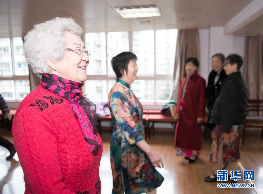 1月17日,王育華(前)向杭州市社會福利中心模特隊的一名隊員學習走臺步。新華社記者 翁忻旸 攝
