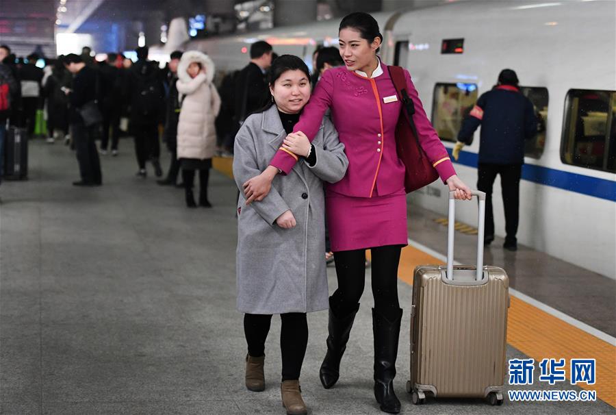 盲人姑娘吳瀟(左)從西安北站中轉(zhuǎn)回延安老家,得到吉如的溫馨服務(wù)。臨別時,吳瀟激動地說:“小姐姐,你的服務(wù)太貼心了,我看不見你,能摸摸你的臉頰嗎?”(1月15日攝)。新華社記者陶明攝