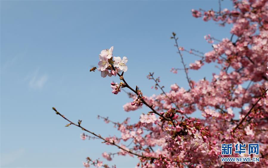 2月24日,蜜蜂在上海松江辰山植物園內(nèi)盛開的河津櫻櫻花叢中飛舞。近日,上海松江區(qū)辰山植物園內(nèi)的河津櫻絢麗綻放,花團(tuán)錦簇間一派盎然春意。 新華社記者 方喆 攝