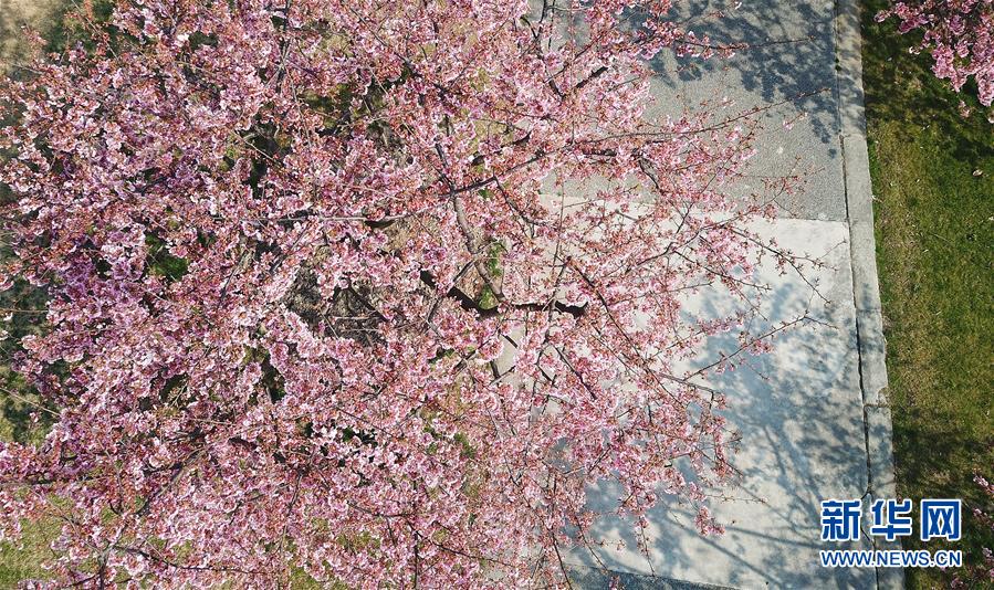 這是2月24日在上海松江辰山植物園內(nèi)拍攝的櫻花小徑(無人機(jī)照片)。 新華社記者 方喆 攝