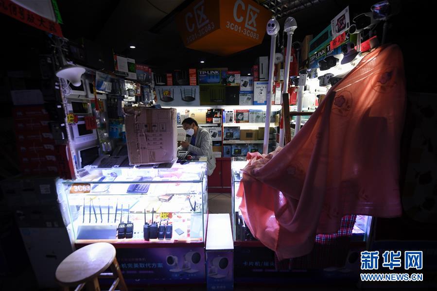 2月24日,在深圳華強(qiáng)北暫未完全開放的賽格電子市場里,商戶在與客戶打電話。 新華社記者 毛思倩 攝