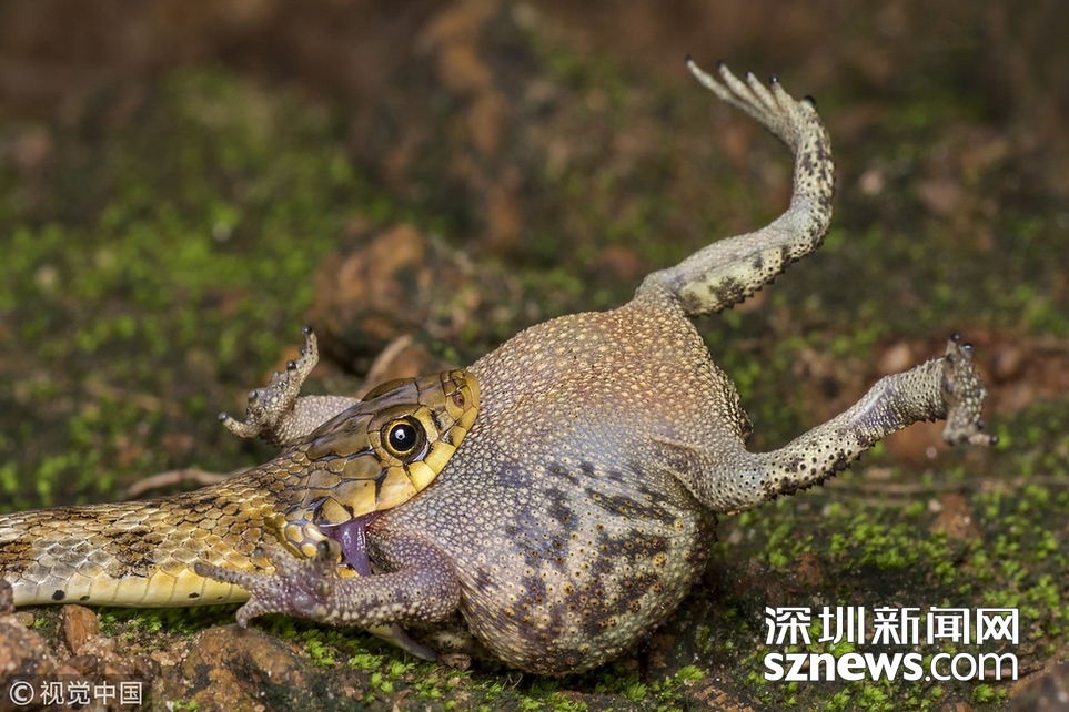 印度加爾各答B(yǎng)olpar,業(yè)余攝影師Agniswar Ghosal在Bolpar散步時拍到蛇大口吞咽蟾蜍的震撼場景。