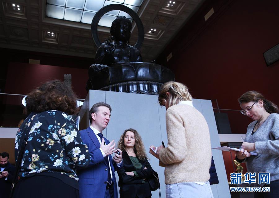 3月2日,在法國巴黎,賽努奇亞洲藝術博物館館長埃里克·勒菲弗(左二)接受媒體采訪。 新華社記者 高靜 攝
