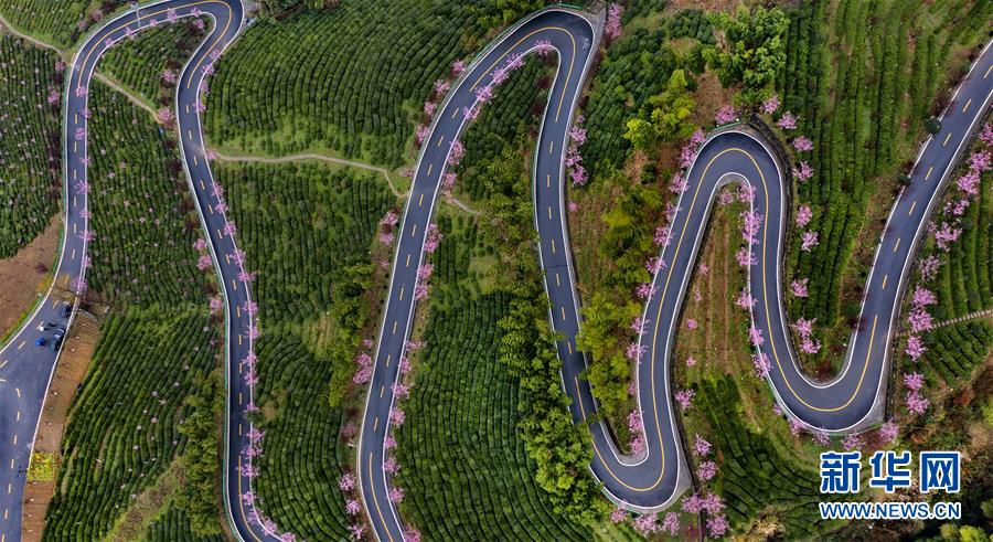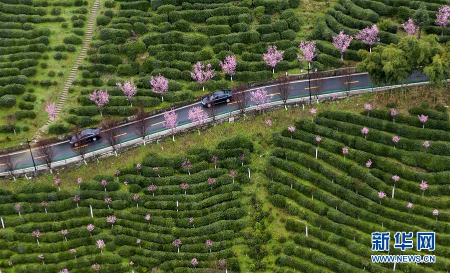 這是3月2日拍攝的平利縣長安鎮(zhèn)洪福茶山,道路兩旁的春梅盛開(無人機(jī)照片)。新華社記者陶明攝