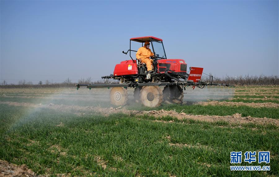 3月4日,建建農(nóng)機合作社社員在蒲城縣椿林鎮(zhèn)平峨村駕駛自走式高桿噴霧機為小麥噴灑除草殺菌劑。近日,為確保疫情期間不誤農(nóng)時,陜西省蒲城縣植保植檢站組織縣內7家農(nóng)作物病蟲害專業(yè)化防治單位,在小麥返青起身期,對麥田進行除草及病蟲害的防控工作。新華社記者李一博攝