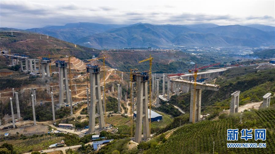 這是3月5日拍攝的中老鐵路南溪河特大橋橫跨在建高速公路(無人機照片)。近期,中老鐵路玉溪至磨憨段有序復工復產(chǎn),由中鐵四局承建的中老鐵路全線重點控制性工程——元江特大橋、南溪河特大橋正在加緊施工建設。新華社記者 江文耀 攝