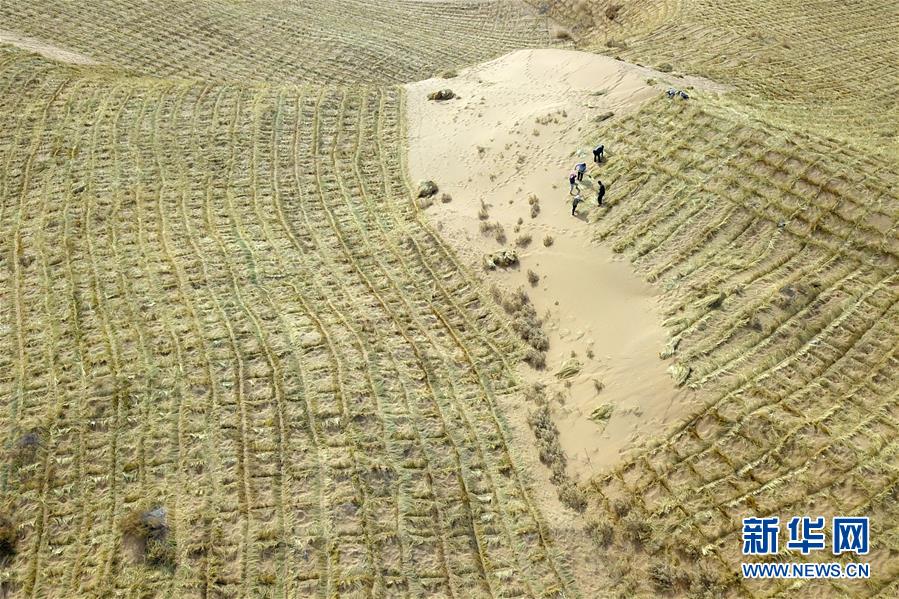3月5日,在古浪縣北部沙區(qū)旱麻崗治沙點,群眾扎草方格壓沙(無人機照片)。初春時節(jié),在騰格里沙漠南緣的甘肅省武威市古浪縣,當(dāng)?shù)馗刹柯毠ぜ鞍瞬缴沉謭鲋紊橙斯餐诳h城北部沙區(qū)旱麻崗治沙點開展春季治沙勞動。新華社記者 范培珅 攝