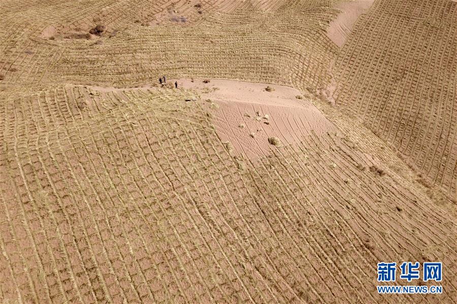 3月5日,在古浪縣北部沙區(qū)旱麻崗治沙點(diǎn),群眾扎草方格壓沙(無(wú)人機(jī)照片)。初春時(shí)節(jié),在騰格里沙漠南緣的甘肅省武威市古浪縣,當(dāng)?shù)馗刹柯毠ぜ鞍瞬缴沉謭?chǎng)治沙人共同在縣城北部沙區(qū)旱麻崗治沙點(diǎn)開展春季治沙勞動(dòng)。新華社記者 范培珅 攝
