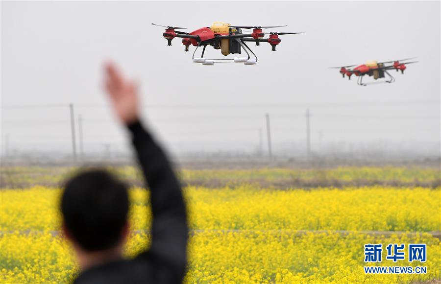 無(wú)人機(jī)在江西省南昌市南昌縣蔣巷鎮(zhèn)對(duì)油菜田進(jìn)行植保作業(yè)(2月28日攝)。新華社記者 彭昭之 攝