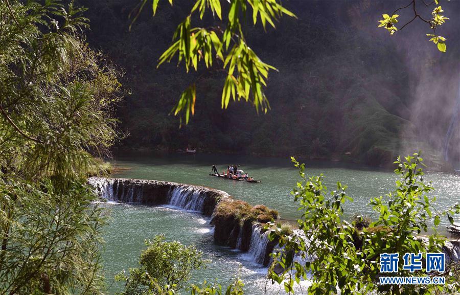 3月8日,游人在云南省曲靖市羅平九龍瀑布群風(fēng)景區(qū)游覽。 初春時節(jié),云南省曲靖市羅平九龍瀑布群風(fēng)景區(qū)內(nèi),湖光山色清澈秀麗,美不勝收。 新華社記者 楊宗友 攝