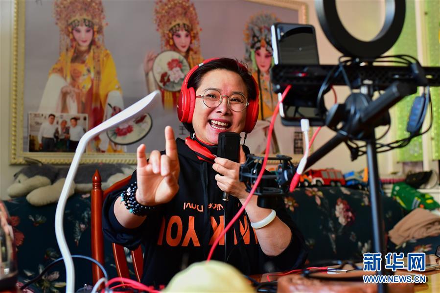 王春梅在直播中演唱晉劇片段(3月5日攝)。 新華社記者 曹陽 攝