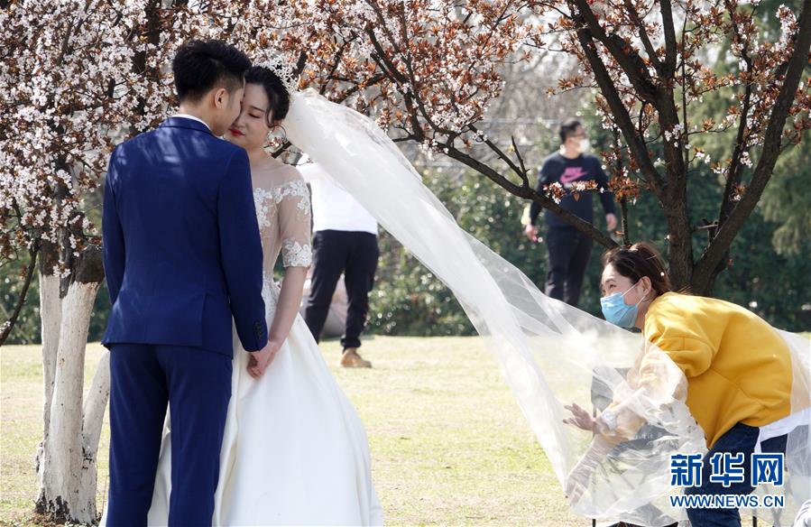 3月15日,在南京東郊體育公園,一名攝影助理給一對(duì)拍攝婚紗照的新人整理婚紗。 當(dāng)日,南京風(fēng)和日麗,市民們來到東郊體育公園,踏青春游。 新華社記者 楊磊 攝