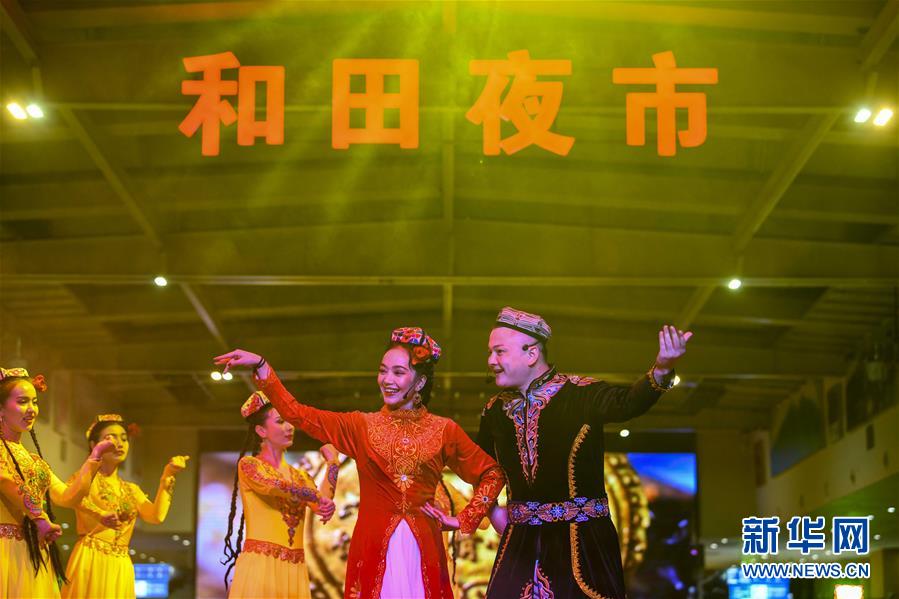 3月16日,在和田夜市環(huán)湖店,舞蹈演員表演節(jié)目。新華社記者 趙戈 攝