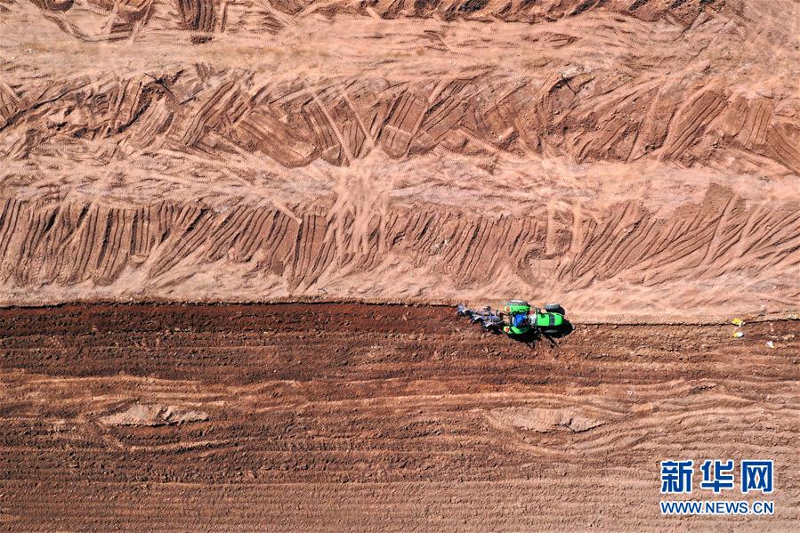 3月18日,在中國(guó)鐵路太原局集團(tuán)有限公司新創(chuàng)云竹生態(tài)農(nóng)業(yè)園,農(nóng)民在用農(nóng)機(jī)犁地(無(wú)人機(jī)照片)。新華社記者 曹陽(yáng) 攝