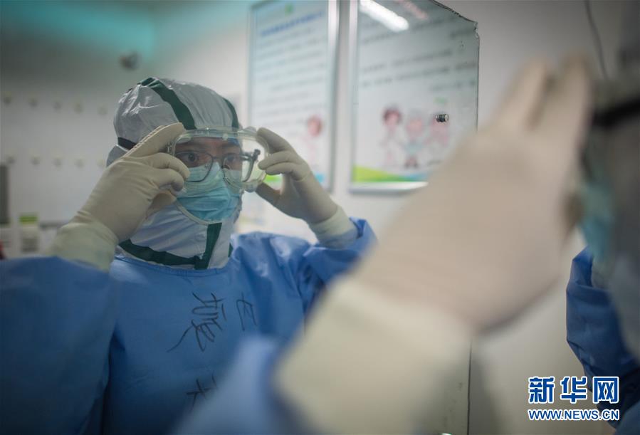 3月19日,在武漢市肺科醫(yī)院清潔區(qū),內(nèi)蒙古醫(yī)療隊(duì)隊(duì)員在穿戴護(hù)目鏡。 新華社記者 肖藝九 攝