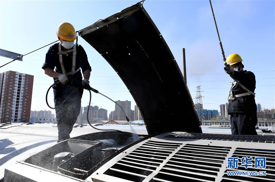 3月19日,鄭州車輛段客車檢車員在對(duì)客車空調(diào)機(jī)組蒸發(fā)器、壓縮機(jī)等內(nèi)部設(shè)備進(jìn)行清洗。新華社記者 李安 攝